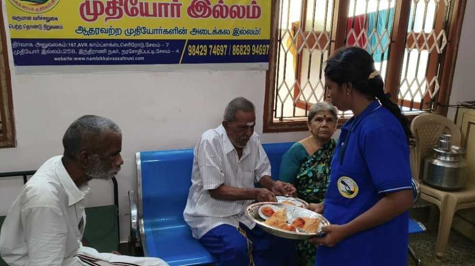 At Nambikkai Vaasal Ilavasa Muthiyor Illam in Salem, we are committed to caring for our elders with love and dignity. Every day, we distribute healthy snacks twice—once in the morning and again in the evening. These nutritious treats are thoughtfully prepared to support the well-being of the senior residents.